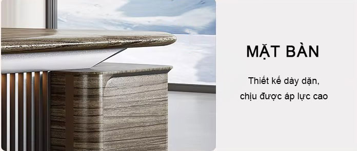 - Mặt bàn dày dặn, sử dụng chất liệu gỗ công nghiệp cao cấp, đảm bảo độ bền bỉ theo thời gian. Lớp hoàn thiện bề mặt có khả năng chống trầy xước, chống thấm nước, giúp duy trì vẻ đẹp sang trọng trong suốt quá trình sử dụng.