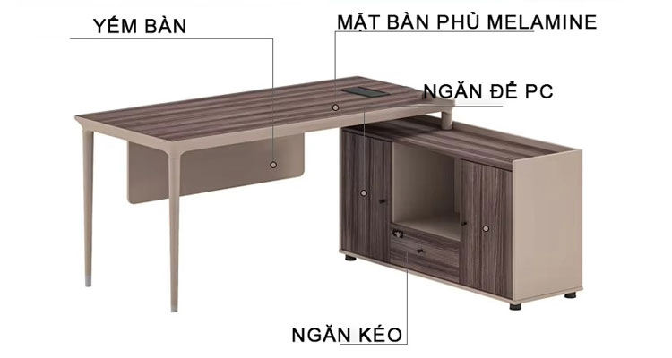 - Phần yếm của bàn được thiết kế kín đáo, giúp che đi phần khung bàn và tạo sự gọn gàng cho không gian làm việc. Yếm bàn không chỉ có tác dụng thẩm mỹ mà còn tạo cảm giác liền mạch cho toàn bộ bàn, mang lại sự thanh thoát, tinh tế cho không gian văn phòng. Phần yếm này còn giúp bảo vệ các chi tiết bên dưới bàn, giữ cho bàn luôn trông sạch sẽ và gọn gàng.