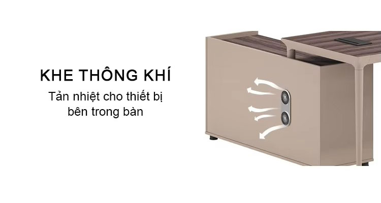 - Tính năng đặc biệt của Bàn SD-31T2016 là khe thông khí nằm dưới mặt bàn, giúp lưu thông không khí tốt hơn và giảm nhiệt độ khi sử dụng các thiết bị điện tử như máy tính, máy in. Khe thông khí này giúp bảo vệ các thiết bị khỏi nhiệt độ quá cao, từ đó nâng cao tuổi thọ của các thiết bị điện tử, đồng thời tạo một không gian làm việc thoáng đãng và dễ chịu.