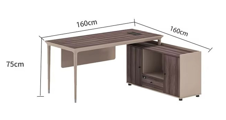 - Có thiết kế chữ L với kích thước tổng thể là 160cm x 160cm x 75cm Kích thước này vừa đủ để tạo ra một không gian làm việc rộng rãi và tiện lợi cho các lãnh đạo mà không chiếm quá nhiều diện tích trong văn phòng. Đây là điểm cộng lớn cho những người lãnh đạo cần một không gian làm việc vừa tiện nghi vừa sang trọng.