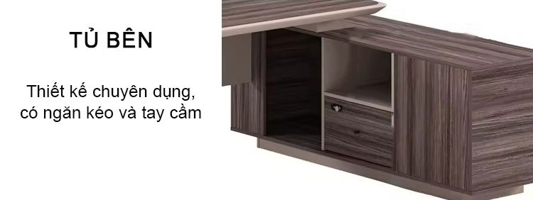 - Đi kèm với bàn là tủ bên, giúp người sử dụng dễ dàng lưu trữ tài liệu, hồ sơ và các vật dụng văn phòng một cách ngăn nắp. Tủ bên có nhiều ngăn kéo và khoang chứa rộng rãi, giúp phân loại tài liệu một cách khoa học và tiết kiệm diện tích. Tủ bên cũng góp phần tăng thêm tính tiện ích và sự gọn gàng cho không gian làm việc, tạo nên một môi trường làm việc chuyên nghiệp và hiệu quả hơn.