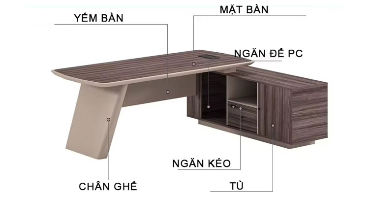 - Có thiết kế yếm bàn thanh thoát, tạo nên sự kín đáo và gọn gàng cho không gian làm việc. Yếm bàn không chỉ mang lại vẻ đẹp thẩm mỹ mà còn che đi phần khung dưới của bàn, giúp không gian làm việc thêm phần sang trọng và chuyên nghiệp. Thiết kế yếm bàn này cũng tạo ra sự hài hòa, giúp bàn trông thanh thoát và dễ dàng kết hợp với các món đồ nội thất khác trong văn phòng.