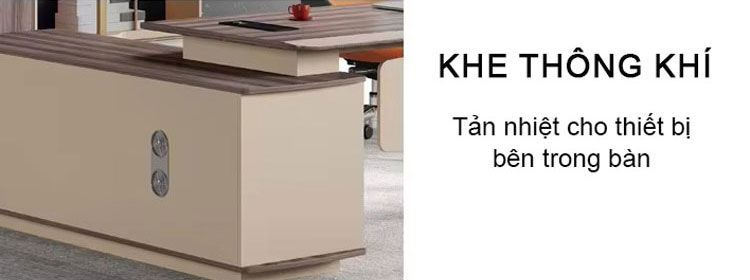 - Tính năng đặc biệt của Bàn SD-36T2216 là khe thông khí nằm dưới mặt bàn, giúp lưu thông không khí tốt hơn và giảm nhiệt độ khi sử dụng các thiết bị điện tử như máy tính, máy in. Khe thông khí này giúp bảo vệ các thiết bị khỏi nhiệt độ quá cao, từ đó nâng cao tuổi thọ của các thiết bị điện tử, đồng thời tạo một không gian làm việc thoáng đãng và dễ chịu.