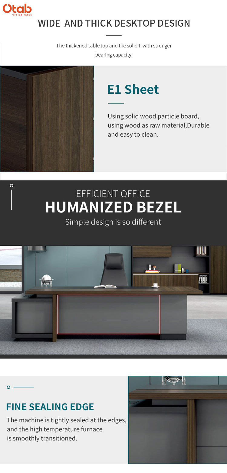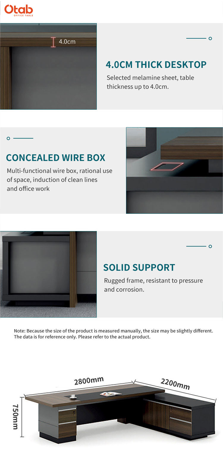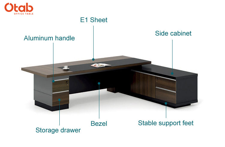 Bàn Otab Handi 03 thiết kế kiểu dáng hiện đại. Mặt bàn chữ L sử dụng gỗ MFC ngoại nhập dày 40mm đã qua xử lý chống mối mọt, cong vênh và bền bỉ. Yếm treo lửng bằng tôn đột lỗ hoặc gỗ MDF 9mm.