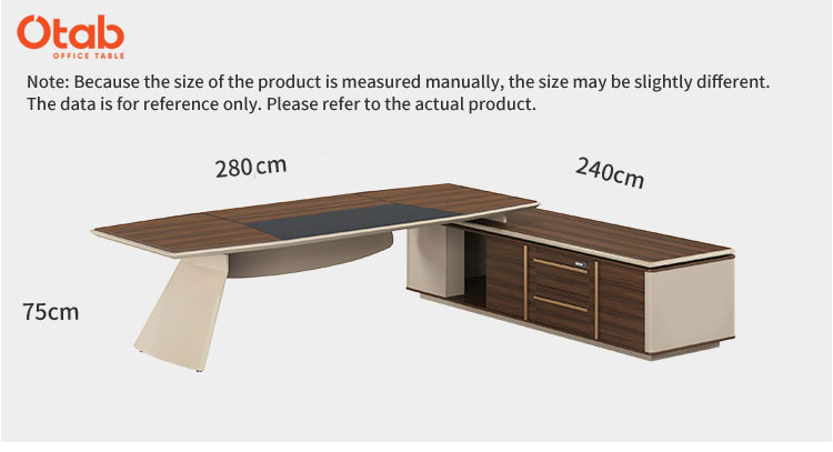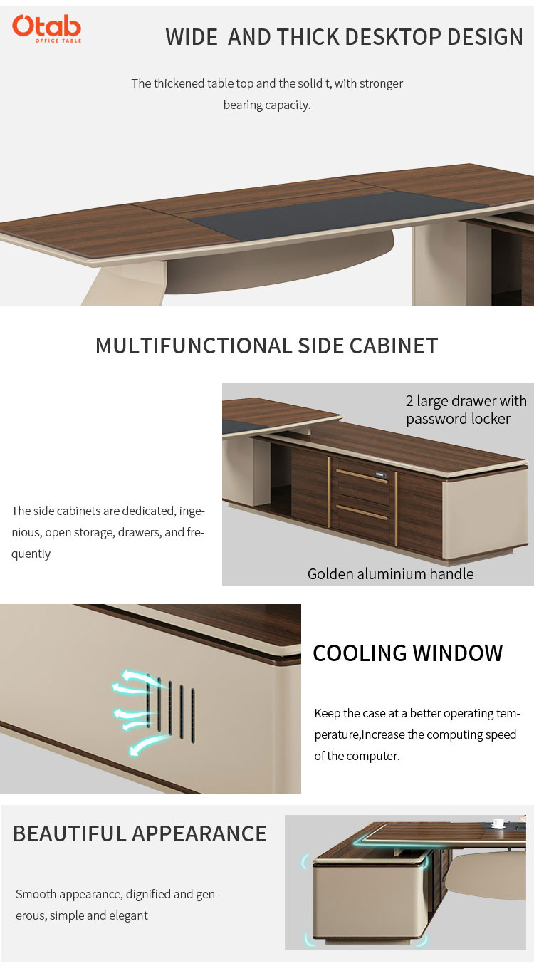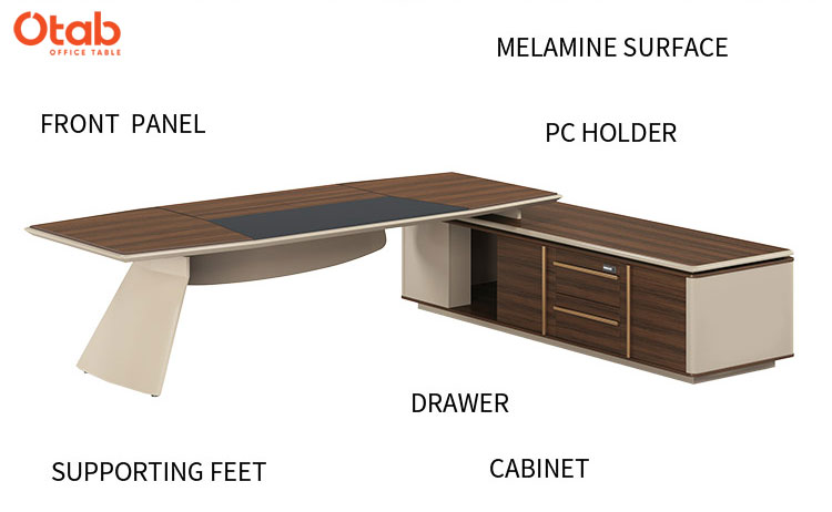 Bàn Otab Send King 01 thiết kế kiểu dáng hiện đại. Mặt bàn chữ L sử dụng gỗ MFC ngoại nhập dày 40mm đã qua xử lý chống mối mọt, cong vênh và bền bỉ. Yếm treo lửng bằng tôn đột lỗ hoặc gỗ MDF 9mm.