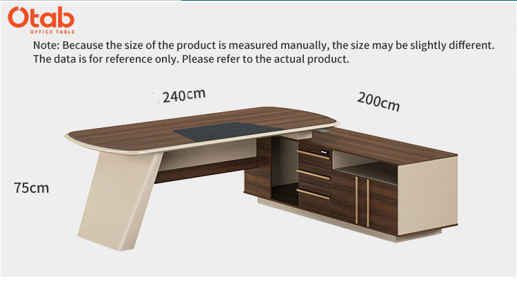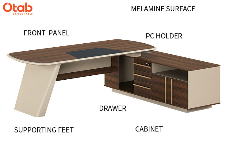 Bàn Otab Send King 02 thiết kế kiểu dáng hiện đại. Mặt bàn chữ L sử dụng gỗ MFC ngoại nhập dày 25mm đã qua xử lý chống mối mọt, cong vênh và bền bỉ. Yếm treo lửng bằng tôn đột lỗ hoặc gỗ MDF 9mm.