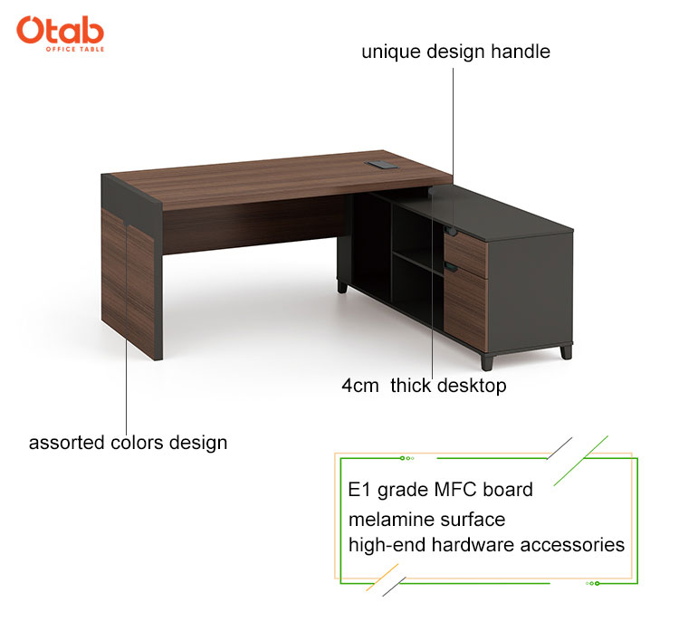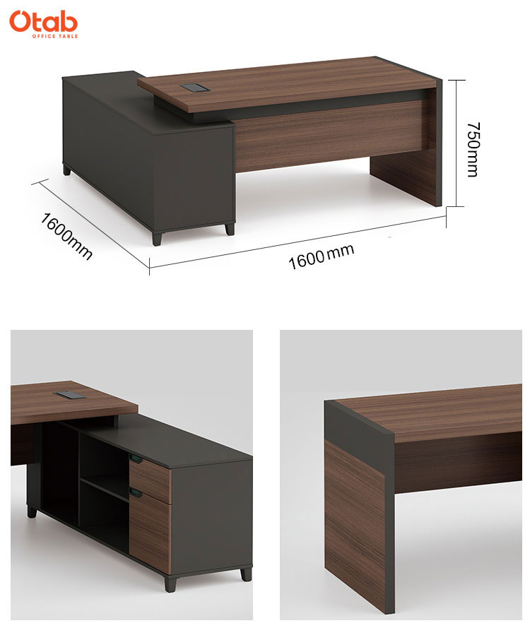 Bàn Otab Top-G 02 thiết kế kiểu dáng hiện đại. Mặt bàn chữ L sử dụng gỗ MFC ngoại nhập dày 40mm đã qua xử lý chống mối mọt, cong vênh và bền bỉ. Yếm treo lửng bằng tôn đột lỗ hoặc gỗ MDF 9mm.