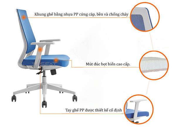 + Thiết kế ghế lưng trung. Vải lưới thoáng mát và độ đàn hồi cao. Khung ghế màu xám bằng nhựa PP cứng cáp.