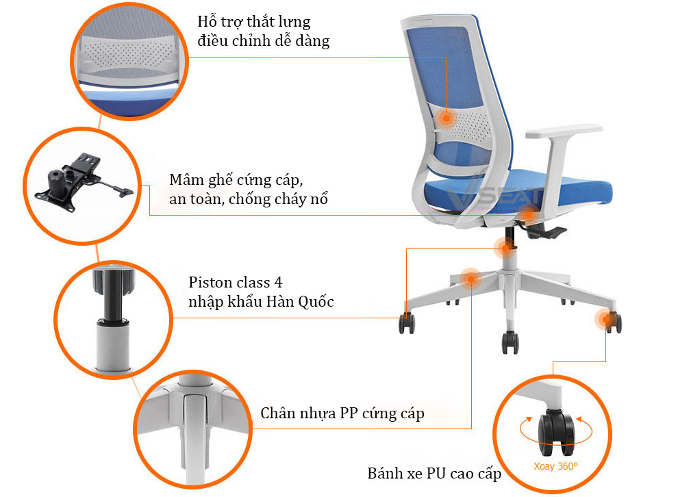 + Mâm ghế điều chỉnh dễ dàng, đảm bảo an toàn cho người ngồi. Với Piston nhập khẩu Hàn Quốc đạt tiêu chuẩn BIFMA.