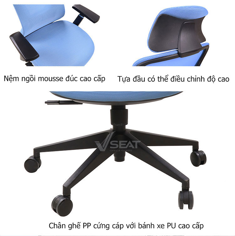 | Headrest (Tựa đầu) | Tựa đầu bọc lưới thoáng mát, điều chỉnh tùy ý |