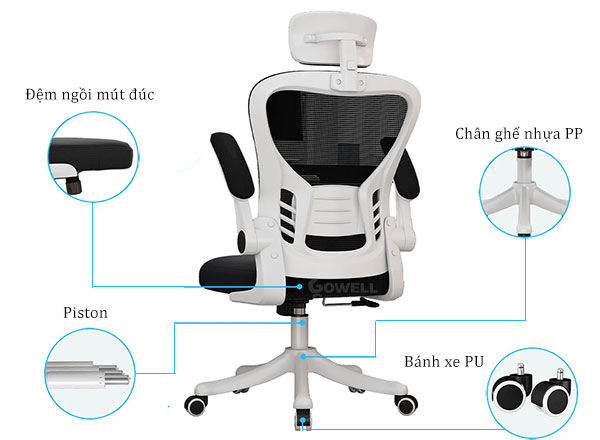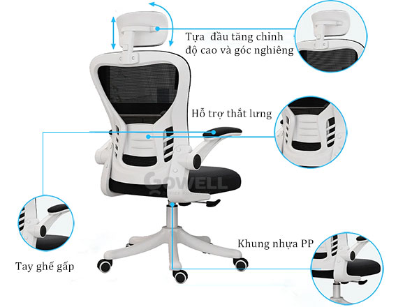 | Armrest (Tay ghế) | Tựa tay bằng nhựa PP, bề mặt bằng chất liệu vải hoặc PU êm ái. Chống căng mỏi cơ vai – tay. |