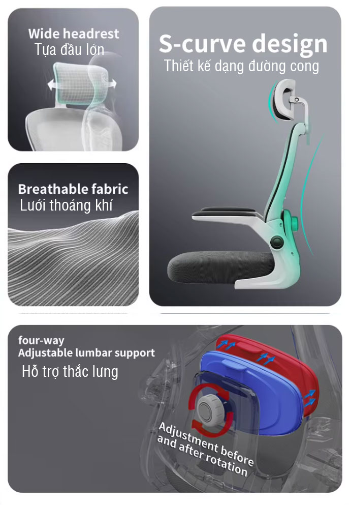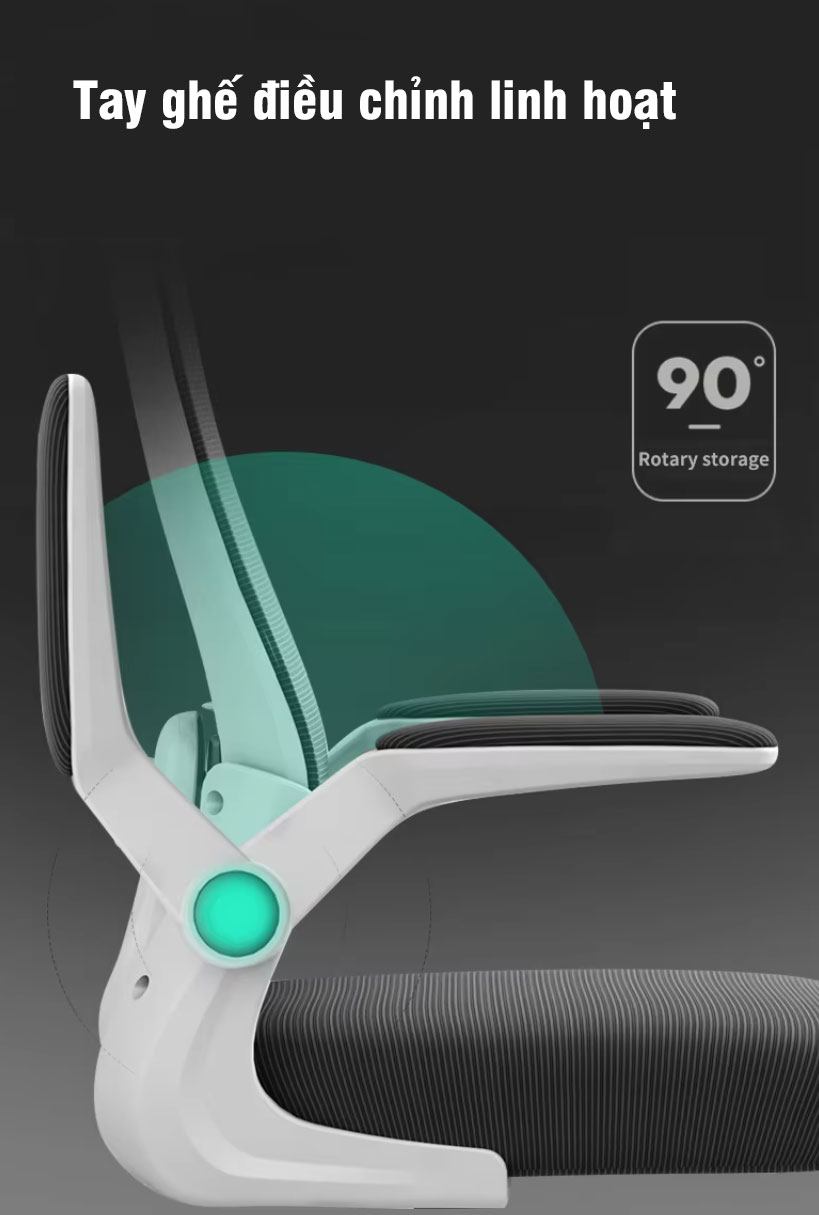 | Armrest (Tay ghế) | Tựa tay bằng nhựa PP, bề mặt bằng chất liệu vải hoặc PU êm ái. Chống căng mỏi cơ vai – tay. |
