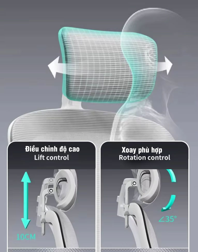 + Tựa đầu có thể điều chỉnh độ cao, độ nghiêng dễ dàng giúp nâng đỡ các khớp xương vùng cổ an toàn, hạn chế mỏi cổ và cho cảm giác ngồi dễ chịu nhất.