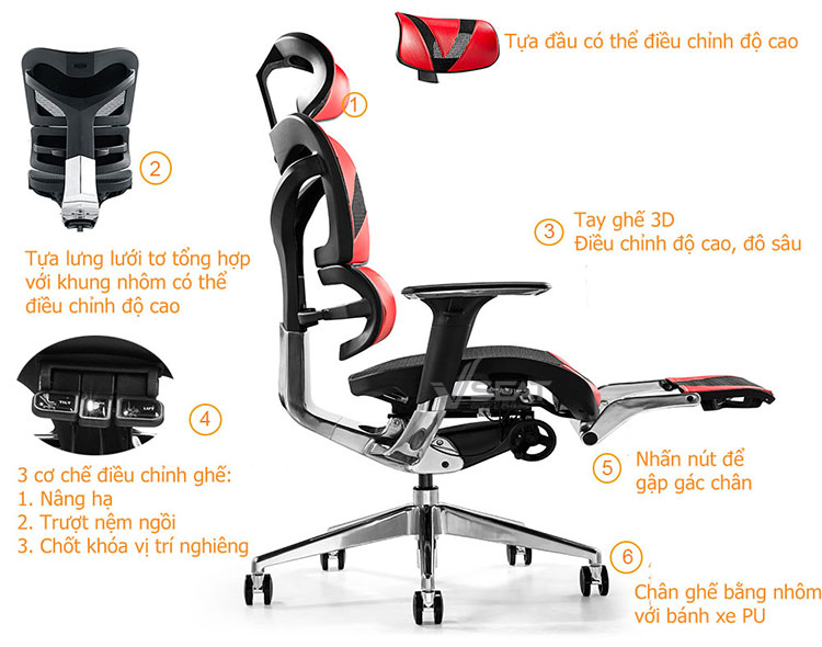 | Headrest (Tựa đầu) | Tựa đầu điều chỉnh độ cao, xoay góc phù hợp với người ngồi. |