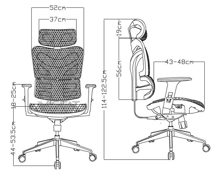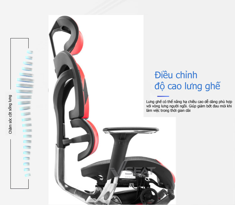 | Back (Lưng ghế) | Lưng ghế thiết kế phân tách phần đỡ lưng và phần eo, điều chỉnh độ cao – thấp, ôm sát và nâng đỡ vùng cột sống người ngồi. |