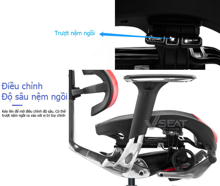 | Seat (Đệm ngồi) | Đệm ngồi vải lưới thoáng mát, thiết kế dáng nước giúp giảm áp lực lên đôi chân điều chỉnh trượt trước-sau 6.5 cm. Gác chân thiết kế kéo ra hoặc đẩy vào linh hoạt, hỗ trợ tư thế nghỉ ngơi – thư giản. |