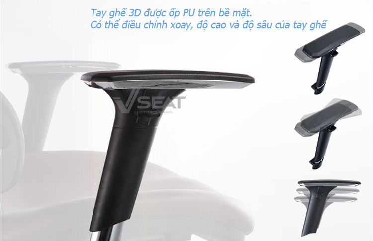 | Armrest (Tay ghế) | Tựa tay khung hợp kim nhôm 3D nâng – hạ, trượt trước – sau, xoay trái – phải bề, bề mặt bọc nhựa PU êm ái. |
