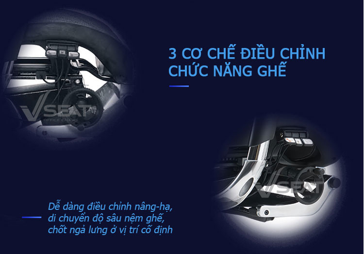 | Mechanism (Bộ điều khiển) | Mâm ghế kết cấu bằng hợp kim nhôm, gắn bộ điều chỉnh đa chức năng bên hông tiện lợi, được cấp bằng sáng chế, ngả lưng khóa đồng bộ 90-135 độ, tựa tay đồng bộ ngả sau. |