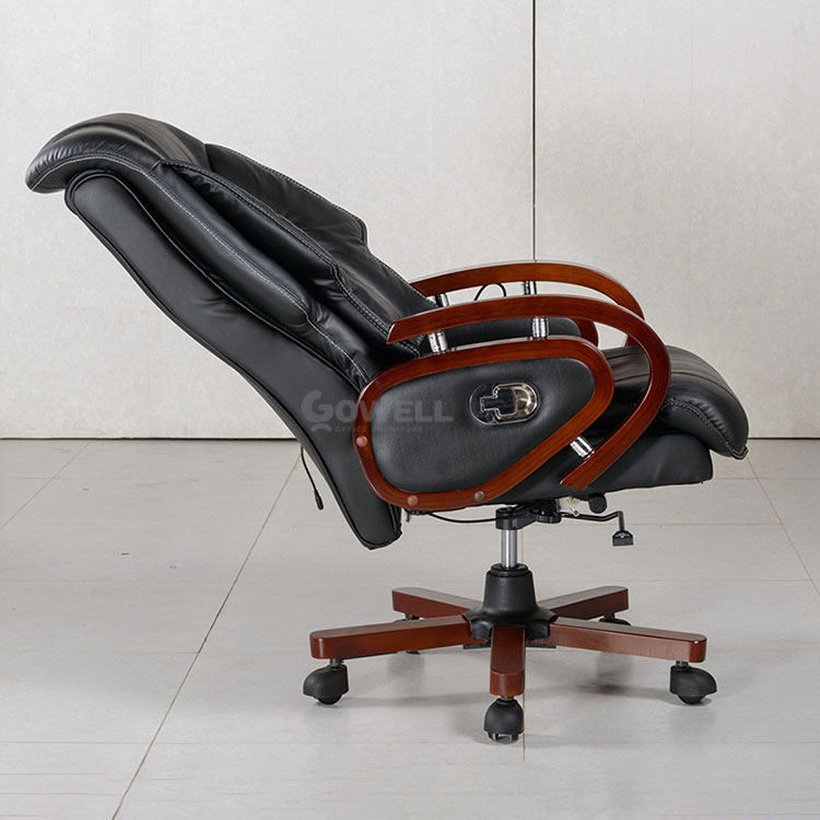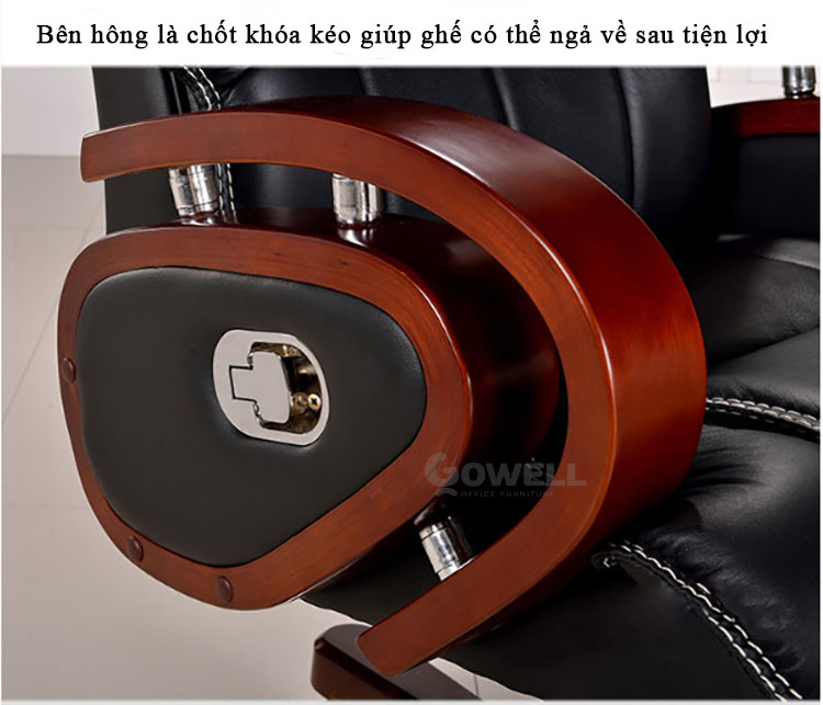 + Tay ghế cố định với kiểu dáng hình tròn cách điệu, được làm từ chất liệu gỗ 2 tầng và kết hợp ốp da 50% hai mặt nhìn rất sang trọng.