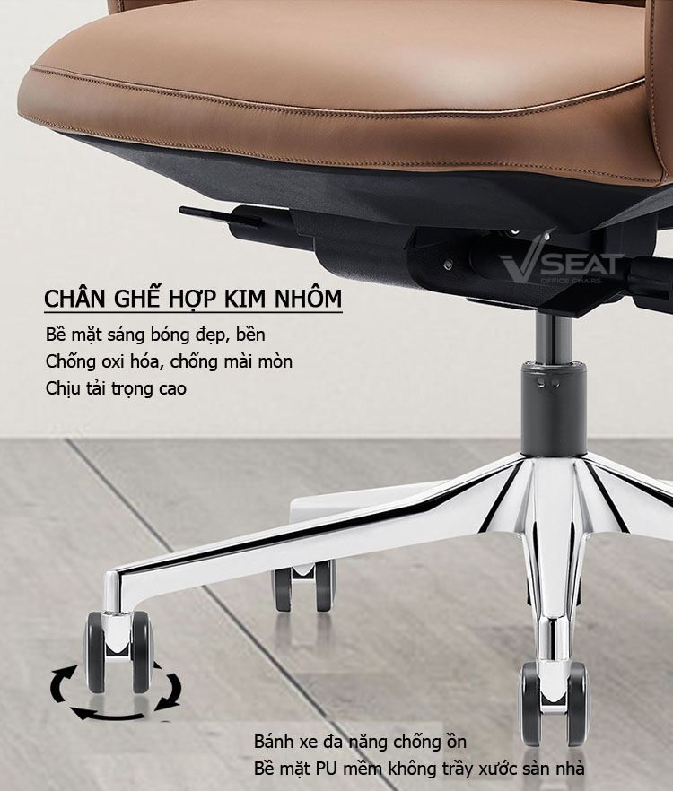 | Base (Chân ghế) | Chân kim loại dày chống chịu lực tốt, giúp giữ thăng bằng mang đến cảm giác an toàn khi ngồi. |