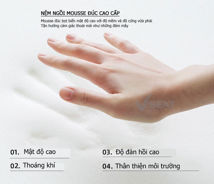 + Nệm ngồi và lưng ghế được sản xuất từ mousse đúc cao cấp với độ đàn hồi cao, thoáng khí, không biến dạng, mềm mại. Tạo cảm giác thoải mái khi ngồi làm việc lâu và bảo vệ sức khỏe tuyệt đối