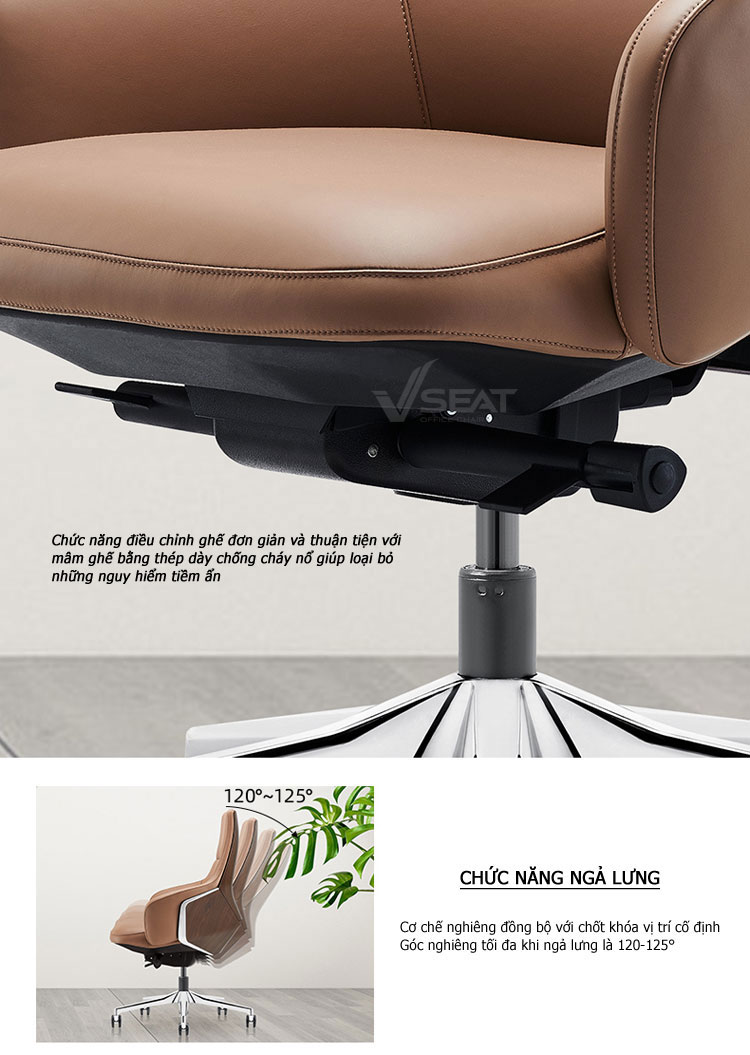 + Thuận tiện với các chức năng điều chỉnh ghế đơn giản với mâm ghế được chế tác từ thép dày, cứng cáp, an toàn, chống cháy nổ giúp loại bỏ những nguy hiểm tiềm ẩn. Cơ chế chốt khóa nghiêng cố định vị trí ngả lưng với góc nghiêng tối đa 120° – 125°