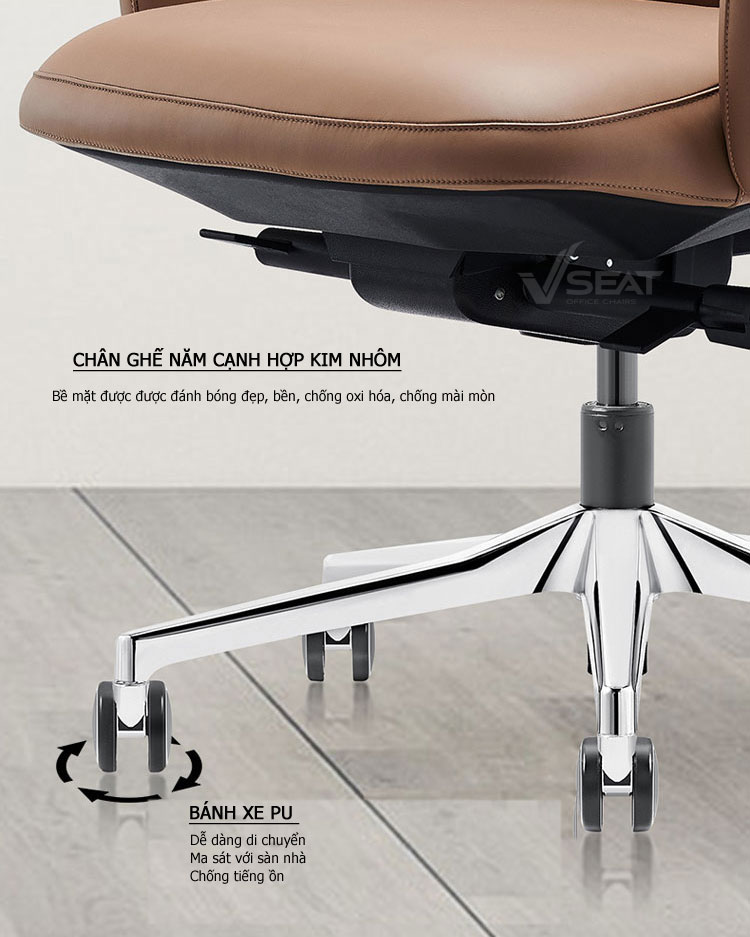 + Chân ghế năm cạnh được chế tác từ hợp kim nhôm chịu trọng tải cao. Bề mặt được đánh bóng đẹp, bền, chống oxi hóa, chống mài mòn. Kết hợp với bánh xe PU đạt tiêu chuẩn quốc tế BIFMA, dễ dàng di chuyển, ma sát với sàn nhà và chống tiếng ồn khi di chuyển