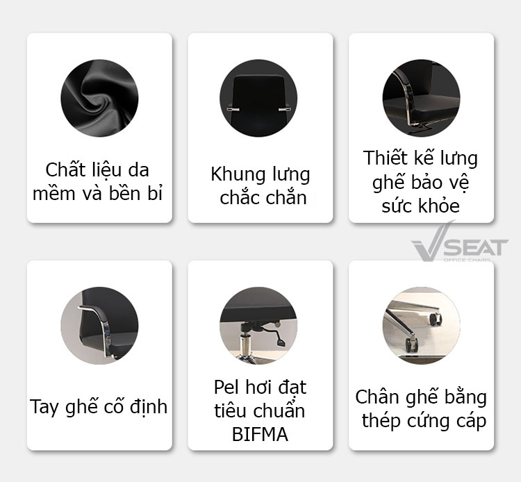 | Base (Chân ghế) | Chân kim loại dày chống chịu lực tốt, giúp giữ thăng bằng mang đến cảm giác an toàn khi ngồi. |