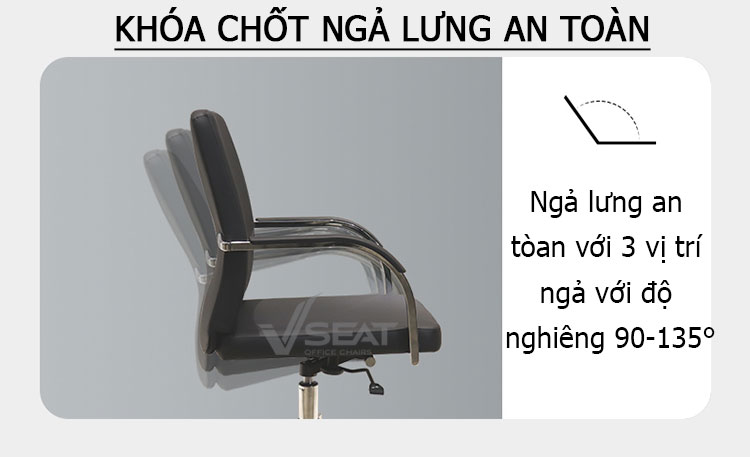 + Ghế có thể điều chỉnh ngả lưng về sau khi nghỉ ngơi, thư giãn với độ nghiêng 90-135°. Cơ chế điều chỉnh đơn giản với chốt khóa vị trí cố định và nút vặn điều chỉnh độ nặng nhẹ khi ngả lưng