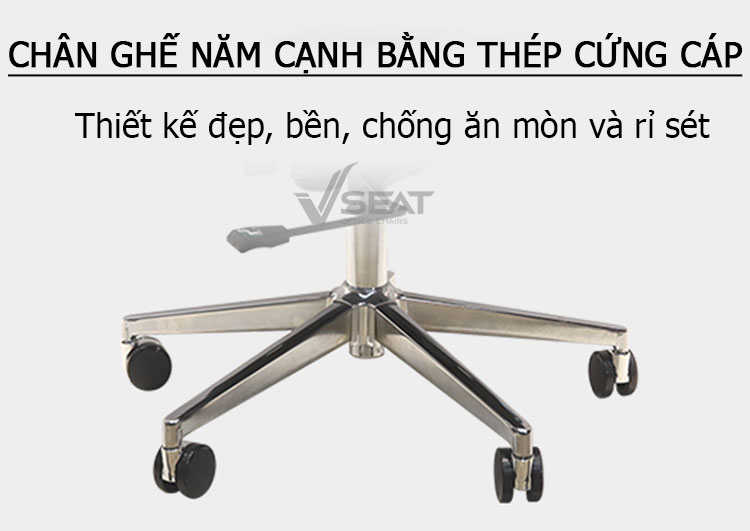 + Chân ghế năm cạnh được chế tác từ hợp kim nhôm chịu trọng tải cao. Bề mặt được đánh bóng đẹp, bền, chống oxi hóa, chống mài mòn. Kết hợp với bánh xe PU đạt tiêu chuẩn quốc tế BIFMA, dễ dàng di chuyển, ma sát với sàn nhà và chống tiếng ồn khi di chuyển