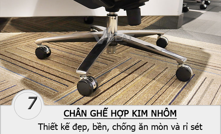 + Chân ghế năm cạnh được chế tác từ hợp kim nhôm chịu trọng tải cao. Bề mặt được đánh bóng đẹp, bền, chống oxi hóa, chống mài mòn