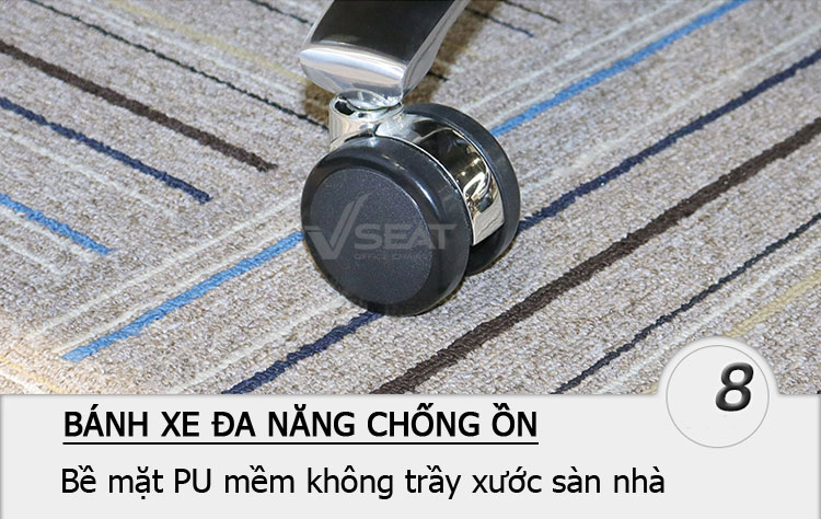 + Bánh xe PU đạt tiêu chuẩn quốc tế BIFMA, dễ dàng di chuyển, ma sát với sàn nhà và chống tiếng ồn khi di chuyển