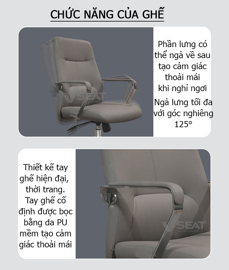 | Armrest (Tay ghế) | Tay ghế bằng nhựa PA bọc da PU êm ái, điều chỉnh ngả đồng bộ với lưng ghế. |