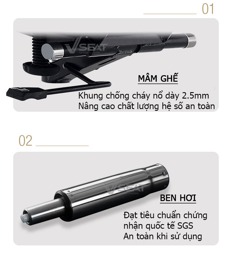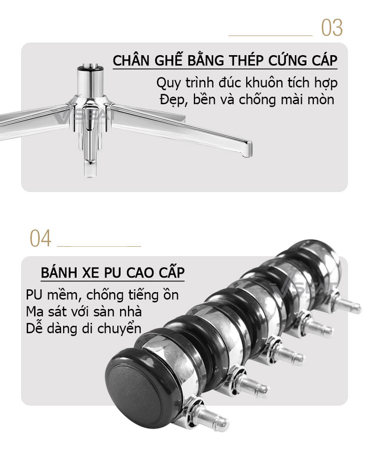 | Base (Chân ghế) | Chân kim loại dày chống chịu lực tốt, giúp giữ thăng bằng mang đến cảm giác an toàn khi ngồi. |