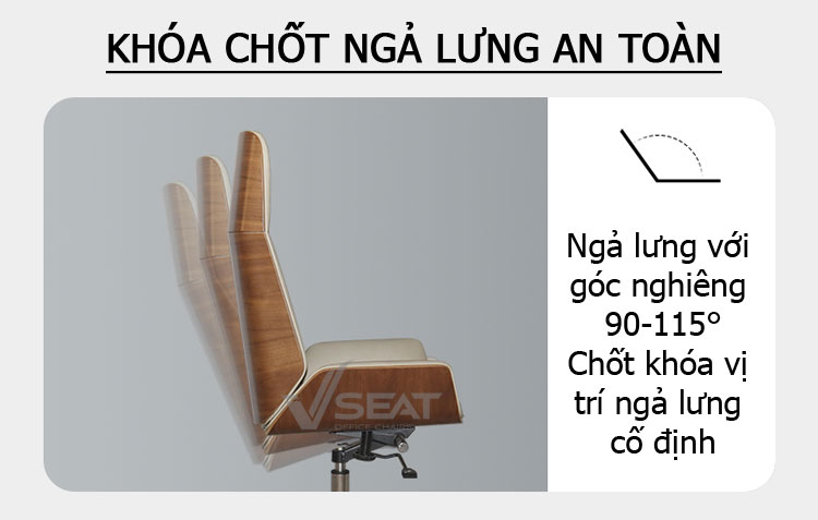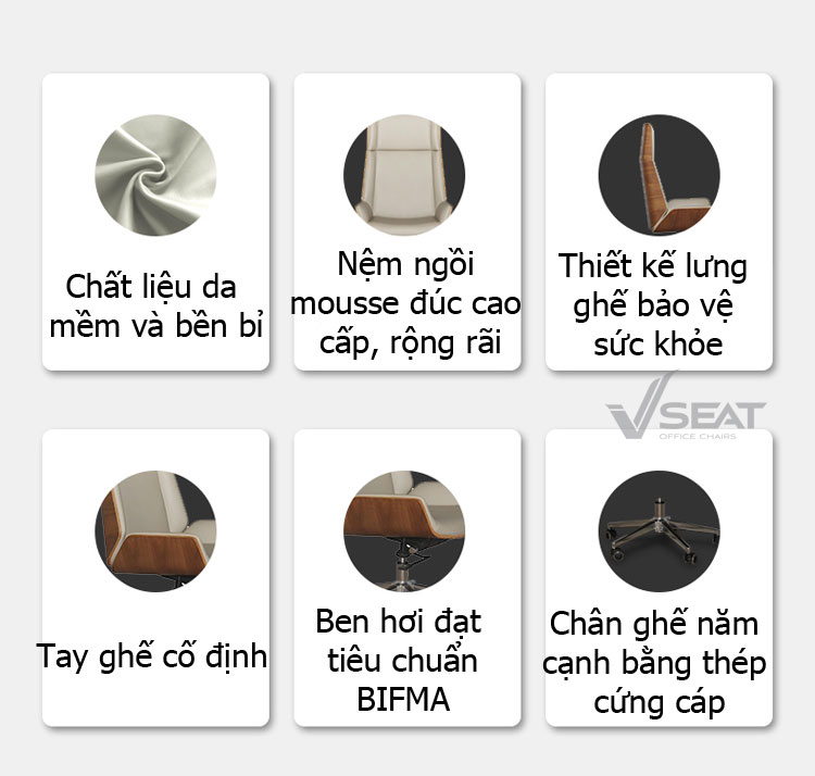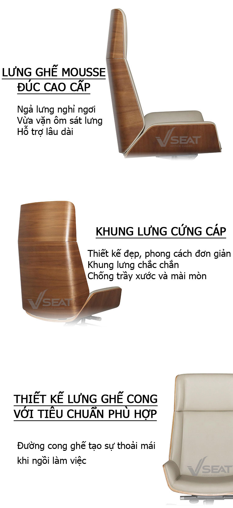 | Back (Lưng ghế) | Khung lưng bằng gỗ ván ép dày chắc chắn. Lưng đệm bằng mút định hình mật độ cao, bọc da PU cao cấp. |