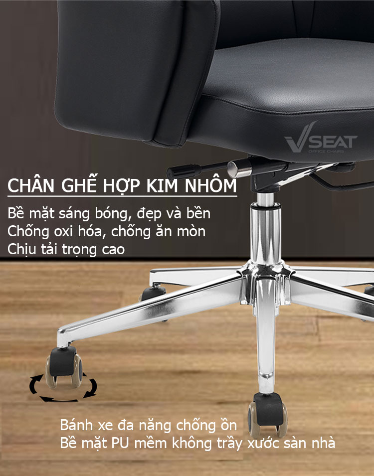 | Base (Chân ghế) | Chân kim loại dày chống chịu lực tốt, giúp giữ thăng bằng mang đến cảm giác an toàn khi ngồi. |