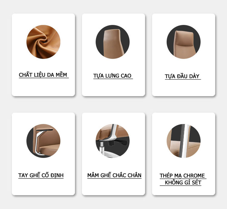 | Base (Chân ghế) | Chân kim loại dày chống chịu lực tốt, giúp giữ thăng bằng mang đến cảm giác an toàn khi ngồi. |