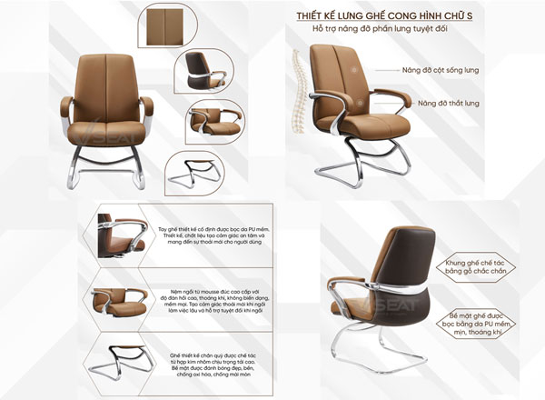 + Thiết kế lưng ghế cong hình chứ S ôm sát với cơ thể người ngồi. Hỗ trợ độc lập các vùng thắt lưng, vai và đầu giúp giảm bớt căng thẳng khi làm việc, thư giãn các cơ và nghỉ ngơi khi làm việc trong thời gian dài.