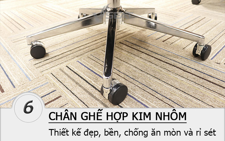 + Chân ghế năm cạnh được chế tác từ hợp kim nhôm chịu trọng tải cao. Bề mặt được đánh bóng đẹp, bền, chống oxi hóa, chống mài mòn