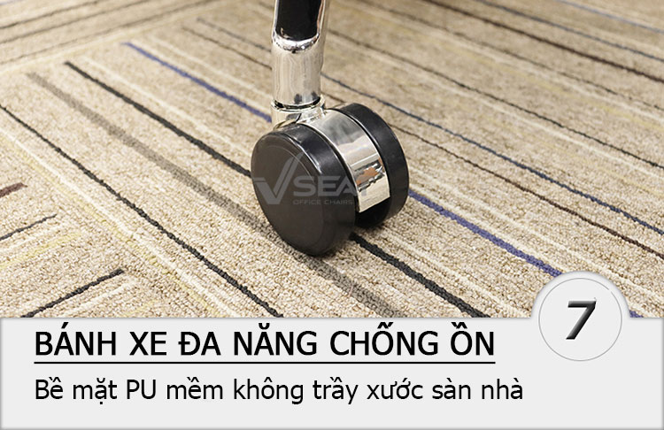 + Bánh xe PU đạt tiêu chuẩn quốc tế BIFMA, dễ dàng di chuyển, ma sát với sàn nhà và chống tiếng ồn khi di chuyển