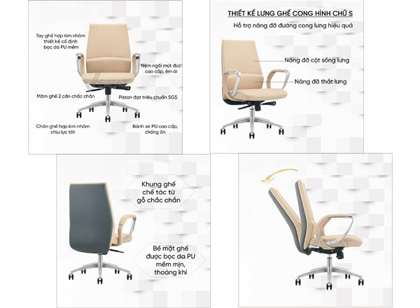| Back (Lưng ghế) | Khung lưng bằng gỗ ván ép dày chắc chắn. Lưng đệm bằng mút định hình mật độ cao, bọc da PU cao cấp. |