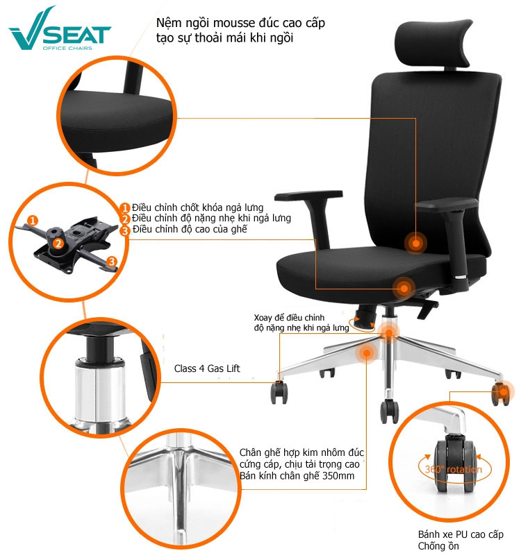 | Base (Chân ghế) | Chân ghế bằng nhôm cao cấp, chống chịu lực tốt và giữ thăng bằng ổn định khi ngồi. |