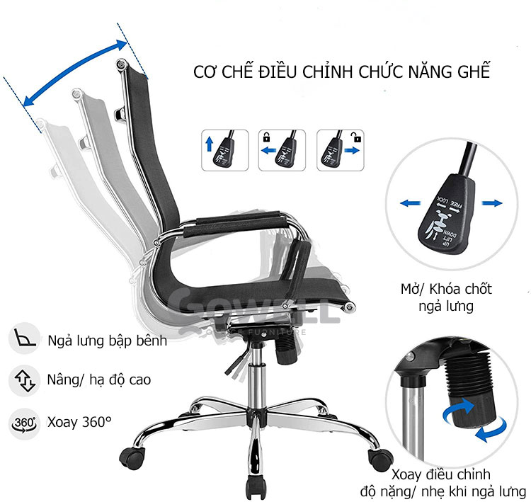 | Base (Chân ghế) | Chân sắt xi dày chống chịu tải trọng cao, giữ cân bằng tạo cảm giác ngồi an toàn |