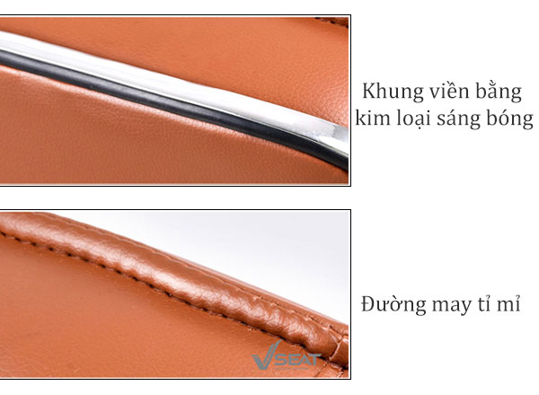 + Viền ghế sử dụng sắt mạ Chrome dát mỏng ốp viền xung quanh tựa, với mục đích cố định lớp đệm bên trong không bị bung sút khi có sự tác động mạnh và tạo hiệu ứng giá trị thẩm mỹ cao.