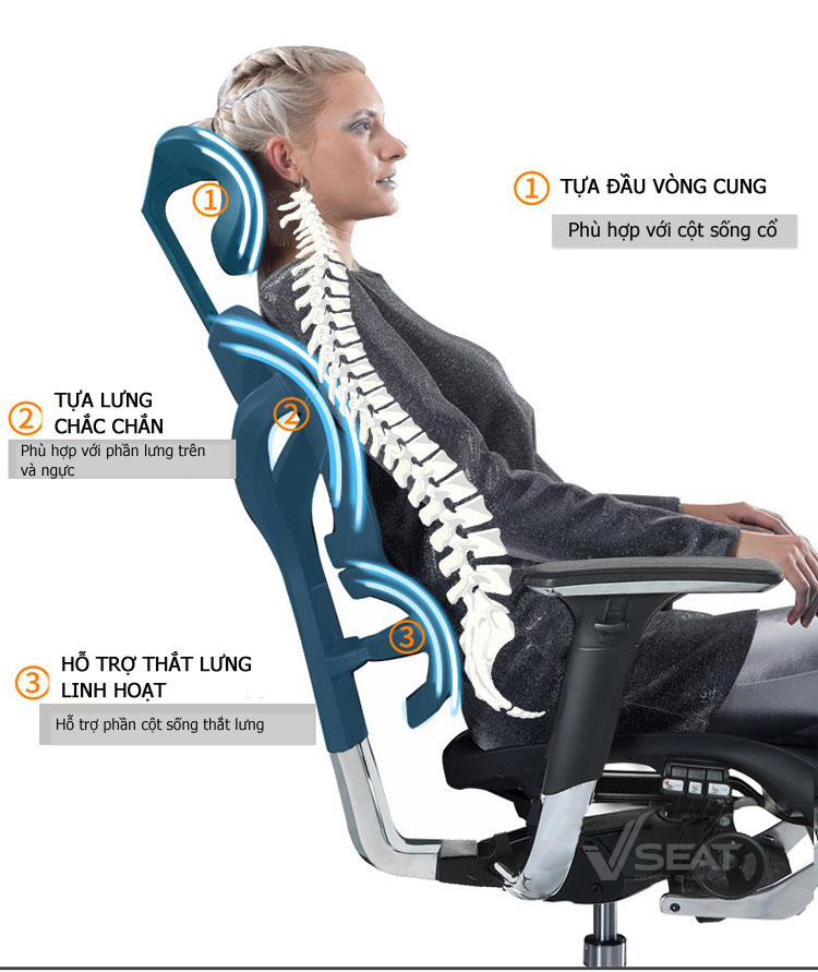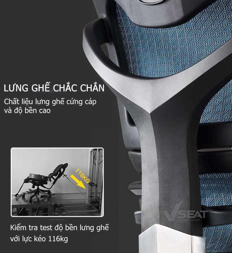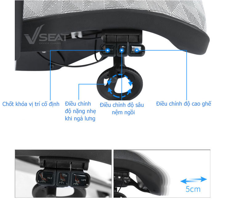 | Mechanism (Bộ điều khiển) | Cơ chế điều khiển đa chức năng, thông minh, tiện lợi: điều chỉnh độ cao ghế, chốt khóa ngả lưng ở vị trí cố định, trượt điều chỉnh độ sâu nệm ngồi. |