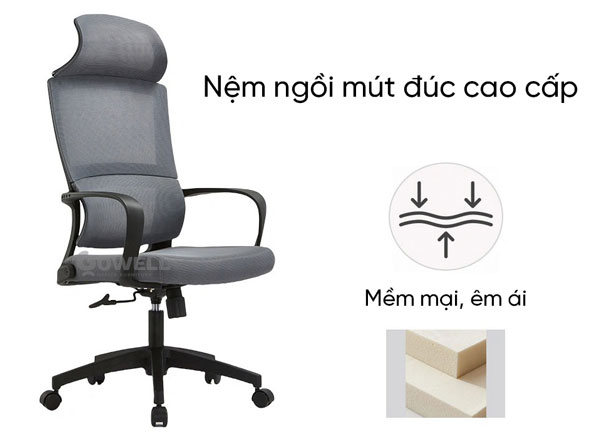 + Lưng ghế bọc vải lưới rỗng tạo lực căng thoáng mát, bền đẹp. Phần đệm ngồi và tựa đầu làm bằng mút đúc dày bọc vải bên ngoài có độ đàn hồi cao, êm ái, không phai màu theo thời gian.