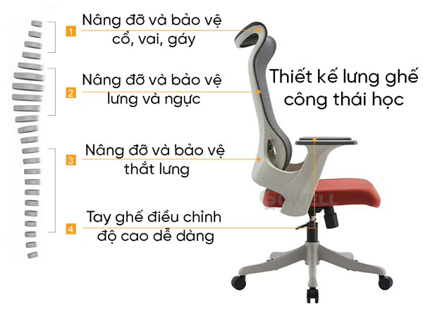 + Lưng ghế cao thiết kế đúng theo tiêu chuẩn Ergonomics với đường cong hình chữ S nâng đỡ cột sống lưng an toàn và tạo tư thế ngồi đúng, hạn chế đau nhức các khớp xương khi ngồi làm việc lâu.