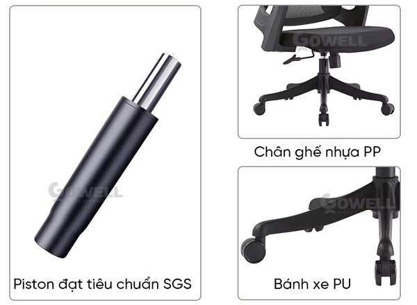 | Base (Chân ghế) | Chân kim loại cao cấp chịu lực tốt, hạn chế tình trạng gỉ sét. |
