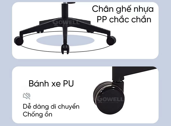 + Chân ghế nhựa PP xoay 5 cạnh hình sao vững chắc với khả năng chịu lực tốt và giữ thăng bằng ổn định. Bánh xe PU loại tốt có đặc tính di chuyển linh hoạt, xoay 360 độ và không phát ra tiếng ồn lớn.