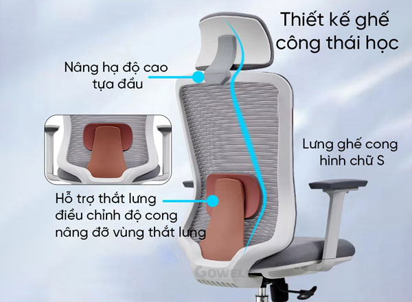 + Lưng ghế cao thiết kế đúng theo tiêu chuẩn Ergonomics với đường cong hình chữ S nâng đỡ cột sống lưng an toàn và tạo tư thế ngồi đúng, hạn chế đau nhức các khớp xương khi ngồi làm việc lâu.
